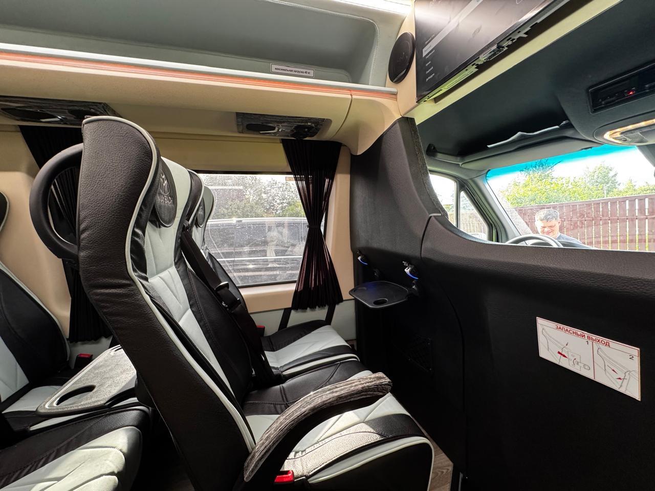 Цвет серебристо\черный металлик, салон кожа алькантара, 19 мест, вода, зонты, wi-fi.